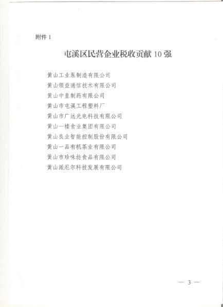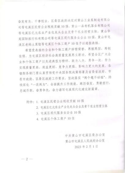 2023年2月1日中共黃山市區(qū)委區(qū)政府公布了《關(guān)于表?yè)P(yáng)屯溪區(qū)民營(yíng)企業(yè)稅收貢獻(xiàn)10強(qiáng)、億元農(nóng)業(yè)產(chǎn)業(yè)化龍頭企業(yè)及骨干農(nóng)業(yè)經(jīng)營(yíng)主體、現(xiàn)代代服務(wù)業(yè)企業(yè)10強(qiáng)、個(gè)體工商戶10佳的通報(bào)》(屯辦[2003]9號(hào)),我公司榮獲屯溪區(qū)民營(yíng)企業(yè)稅收貢獻(xiàn)10強(qiáng)之一。