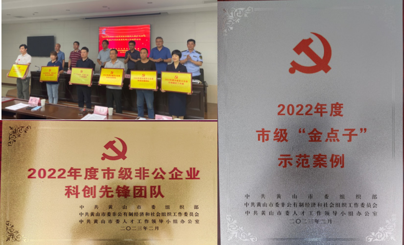 區(qū)委領導為獲評2022年度省、市級先進典型授牌。我公司榮獲“2022年度市級非公企業(yè)科創(chuàng)先鋒團隊”和“2022年度市級“金點子”示范案例”榮譽稱號。